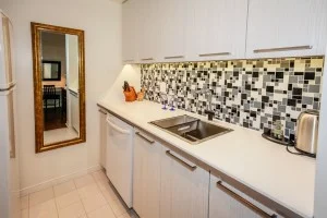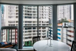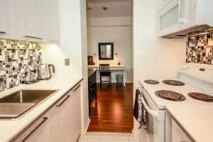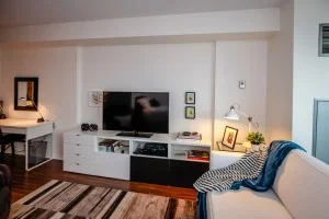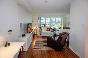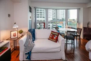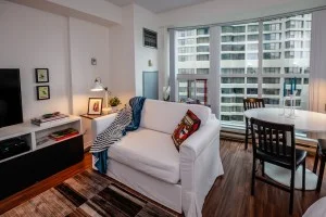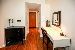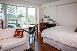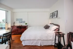 The price of condos in Toronto has sky-rocketed and sometimes it's just a matter or getting into the market so that you can upgrade at a later date. If that means a studio apartment for you, it doesn't have to mean you can't have it all. In this studio condo on a really tight budget, we managed to squeeze in; a bedroom with a queen sized bed, a TV area, a dining area and even an office area! It's all a matter of space planning and keeping things cohesive. This is a rental unit for one lucky person!!
