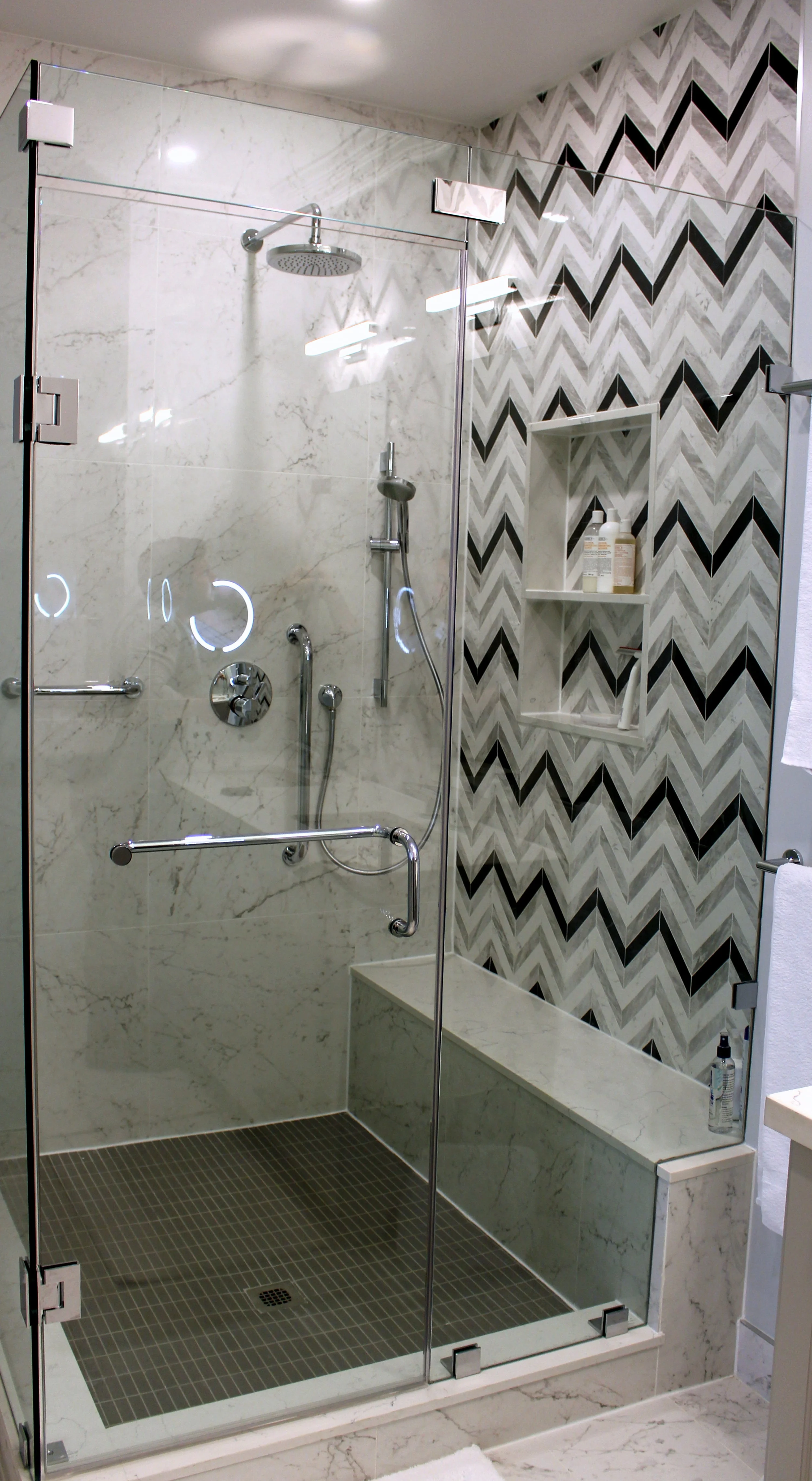 Susan Abramsonpenthouse, condo, renovations, renovation, closed kitchen, not open concept, large living room, two sitting areas in living room, stessless furniture, stressless sofa, stressless chair, leather furniture, persian rugs, macy, macy's rug, crate and barrel, decorium, custom kitchen, custom built ins, custom bathrooms, grey tones, bleached oak floors, red oak bleachedComment
